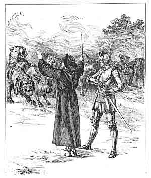 ![]() Click to enlarge Of many beasts, that roared outrageously, * * * * * * * But soone as they approcht with deadly threat, The Palmer over them his staffe upheld.'' |