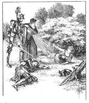 But in spite of the lovely music heard on every side, Sir Guyon and the Palmer never left their path; they kept on through many groves and thickets, till at last they came in sight of the wicked enchantress herself. She lay, half-sleeping, on a bed of roses, clad in a veil of silk and silver, all round were many fair ladies and boys singing sweetly. Not far off was her last victim, a gallant-looking youth, over whom she had cast an evil spell. His brave sword and armour hung idly on a tree, and he lay sunk in a heavy slumber, forgetful of all the noble deeds in which he had once delighted.