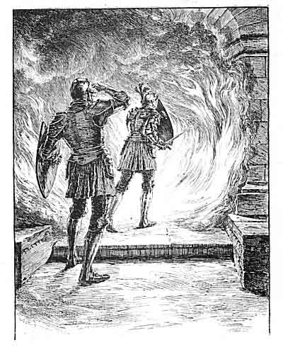 So saying, resolved to try her utmost, she threw her shield in front of her face, and, holding the point of her sword straight in front of her, she advanced to the fire. The flames immediately gave way, and parted on either side, so that she walked through without hindrance.