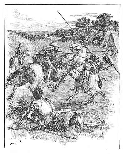 The field was strewn with shivered spears, and broken swords, and scattered shields, showing how severe the fight had been; there might be seen also loose steeds running at random, whose luckless riders had been overthrown, and squires hastening to help their wounded masters. But still the Knights of Maidenhood came off the best, till there entered on the other side a stranger knight.