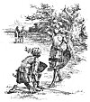 The day after Sir Scudamour left the House of Care, as he rode sadly on his way, he unexpectedly saw an armed Knight sitting in the shade on the edge of a forest, while his steed grazed beside him. Directly this Knight saw Scudamour, he mounted and rode eagerly towards him, as if he intended mischief; but, as soon as he saw the arms borne by him, he lowered his spear and turned aside. Sir Scudamour wondered at this, but the other said, "Ah, gentle Scudamour, I submit myself to your grace, and ask pardon of you for having this day almost done you an injury."