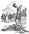[paragraph continues] Wind and weather served them so well that in one day they reached the island, where they found great hosts of men in order of battle ready to repel them, who held possession of the ground and forbade them to land. Nevertheless they would not refrain from landing, but as they drew near, Talus jumped into the sea, and wading through the waves, gained the shore, and chased the enemy away. Then Artegall and the old Knight landed, and marched forward to a town which was in sight.