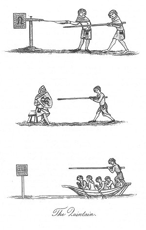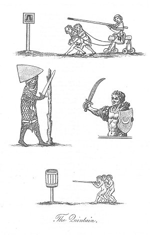THE QUINTAIN.--Tilting or combating at the quintain is certainly a military exercise of high antiquity, and antecedent, I doubt not, to the jousts and tournaments. The quintain, originally, was nothing more than the trunk of a tree or post set up for the practice of the tyros in chivalry. 2 Afterward a staff or spear was fixed in the earth, and a shield being hung upon it, was the mark to strike at: the dexterity of the performer consisted in smiting the shield in such a manner as to break the ligatures and bear it to the ground. In process of time this diversion was improved, and instead of the staff and the shield, the resemblance of a human figure carved in wood was introduced. To render the