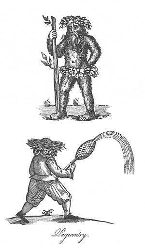 At the bottom of the thirty-seventh plate is one of the Green Men flourishing his fire club, which is taken from Bate's treatise on fireworks issued in 1634. At the top of the same plate is a Wild Man or Woodwose or Wodehouse, a character very common and popular in the pageants of former times. It was in a dress like this, I suppose, that Gascoyne appeared before Queen Elizabeth in 1575, as already narrated. The figure itself is taken from a ballad, in black letter, entitled "The mad, merry pranks of Robin Good Fellow." Bishop Percy, probably with great justice, supposes it to have been one of the stage-disguisements for the representation of this facetious spirit.