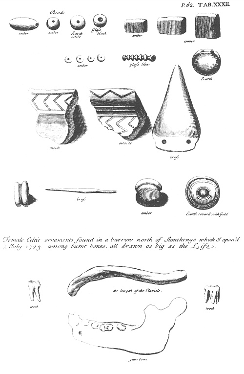 Plate 32. Female Celtic ornaments found in a barrow north of Stonehenge which I opend 5 July 1723. among burnt bones, all drawn as big as Life.