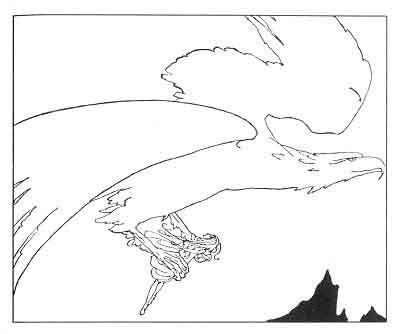 was lifting it off the fire he heard a whirr of wings above his head. Looking up, he saw a mighty eagle, the largest eagle that ever appeared in the sky. The eagle circled round and round and came above Loki's head. "Canst thou not cook thy food?" the eagle screamed to him.