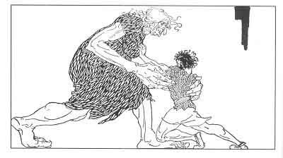 and less able under her terrible grasp. She forced hi ii down, down, and at last he could only save himself from being left prone on the ground by throwing himself down on one knee and holding the hag by the shoulders. She tried to force him down on the ground, but she could not do that. Then she broke from him, hobbled to the door and went out of the hall.