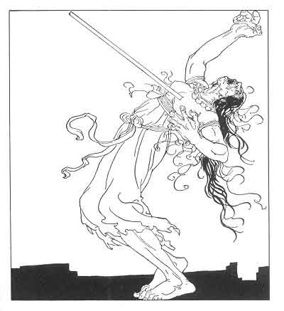 pierced the witch. She stood livid as one dead but fell not down. A third time Odin hurled his spear. And now, pierced for the third time, the witch gave a scream that made all Asgard shudder and she fell in death on the ground.