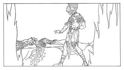 She was the bravest and the wisest and the most beautiful maiden in the world: Sigurd knew that it was so. He laid his sword Gram at her feet, and he said her name, "Brynhild." He told her how he had slain the Dragon, and how he had heard the birds tell of her. She rose from the couch and bound her wondrous hair on her head. In wonder he watched her. When she moved it was as though she walked above the earth.