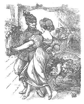 The clock struck eleven and a youth clothed in green entered the room. He went straight up to our Kitty and began to dance with her. All the girls couldn't keep from laughing, but they daren't laugh openly. So they held their aprons over their faces. Kitty was very angry, but she kept on dancing like the wind. She thought: Let the fools laugh; they'd be glad enough to dance with the lad themselves."