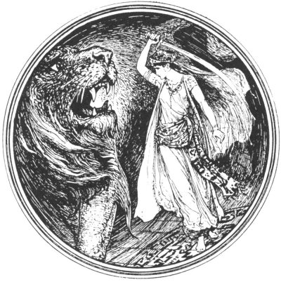 side, and seizing one of the hairs of his mane repeated two or three words over it. In an instant it became a sword, and with a sharp blow she cut the lion's body into two pieces. These pieces vanished no one knew where, and only the lion's head remained, which was at once changed into a scorpion. Quick as thought the princess assumed the form of a serpent and gave battle to the