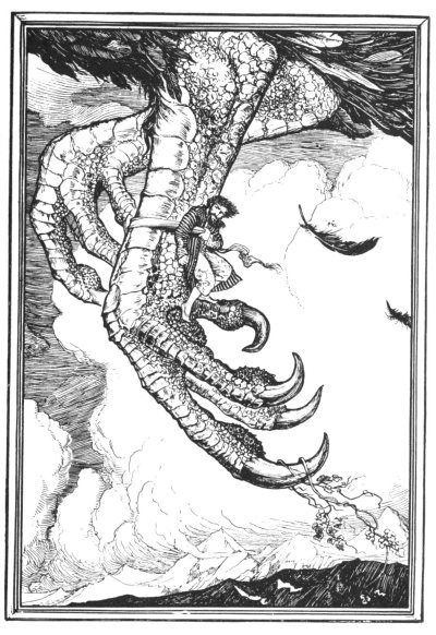 Sure enough the bird settled slowly down upon it, covering it with its wings to keep it warm, and I cowered close beside the egg in such a position that one of the bird's feet, which was as large as the trunk of a tree, was just in front of me. Taking off my turban I bound myself securely to it with the linen in the hope that the roc, when it took flight next morning, would bear me away with it from the desolate island. And this was precisely what did happen. As soon as the dawn appeared the bird rose into the air carrying me up and up till I could no longer see the earth, and then suddenly it descended so swiftly that I almost lost consciousness. When I became aware that the roc had settled and that I was once again upon solid ground, I hastily unbound my turban from its foot and freed myself, and that not a moment too soon; for the bird, pouncing upon a huge snake, killed it with a few blows from its powerful beak, and seizing it up rose into