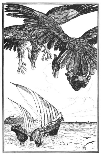 Scarcely had they finished their ill-omened repast, when the air above us was darkened by two mighty shadows. The captain of my ship, knowing by experience what this meant, cried out to us that the parent birds were coming, and urged us to get on board with all speed. This we did, and the sails were hoisted, but