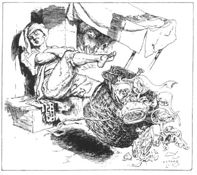 As long as our father lived Alnaschar was very idle. Instead of working for his bread he was not ashamed to ask for it every evening, and to support himself next day on what he had received the night before. When our father died, worn out by age, he only left seven hundred silver drachmas to be divided amongst us, which made one hundred for each son. Alnaschar, who had never possessed so much money in his life, was quite puzzled to know what to do with it. After reflecting upon the matter for some time he decided to lay it out on glasses, bottles, and things of that sort, which he would buy from a wholesale merchant. Having bought his stock he next proceeded to look out for a small shop in a good position, where he sat down at the open door, his wares being piled up in an uncovered basket in front of him, waiting for a customer among the passers-by.