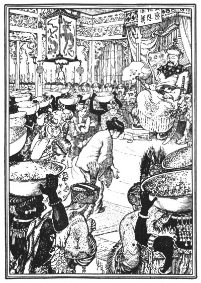 They entered the palace, and, after kneeling before the Sultan, stood in a half-circle round the throne with their arms crossed, while Aladdin's mother presented them to the Sultan.