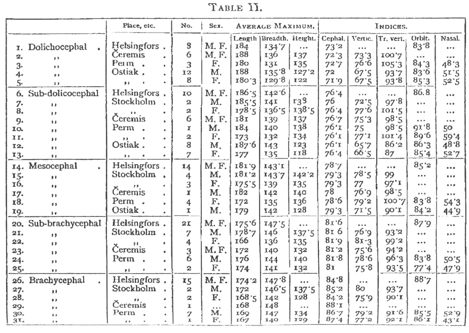 [paragraph continues] They were measured by Dr. Weinberg, and were taken from burial-places dating from the tenth to the twelfth century. 1 As he has calculated the vertical and trans-vertical indices from the maximum height of Virchow, I have added two columns in which the bregma height is used, and enclosed the figures in square brackets.
