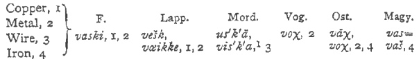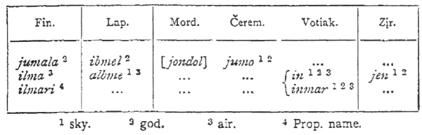 [paragraph continues] Though F. jumala now means 'god,' the corresponding word in Čeremis also means 'sky,' and the Mordvin for 'lightning,' jondol, stands for jom-dol, 'the fire of jom,' 2 On the other hand, the F. ilma, 'air,' corresponds with the Permian words for 'air,' 'sky,' 'god,' and the proper name Ilmari, L. Ilmaris, who is sometimes substituted for the native wind-god, is formally the equivalent of V. inmar, 'sky,' 'god.' It can hardly be doubted that sky is the older meaning, though it may always have been associated with the idea of 'sky-spirit,' and that 'god' is secondary. It would be interesting to know at what stage in the history