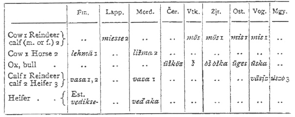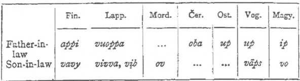 In the above equations, though four of the words for father-in-law are used in the double sense, yet to the Voguls and Ostiaks the word up only means 'wife's father,' hence there is the presumption that this was the original meaning of the others. It is evident that to a household framed on the Čeremisian system there could never be occasion for one member to address another as 'son-in-law,' though there might be several in the family. The term could only be used by a man or woman in a different dwelling—by the father and mother, in fact, of one of the wives in the first-mentioned household. The fact that the word for 'son-in-law' covers nearly the same area as that for 'father-in-law,' and that the first necessarily connotes the existence of a wife and her parents, immensely increase