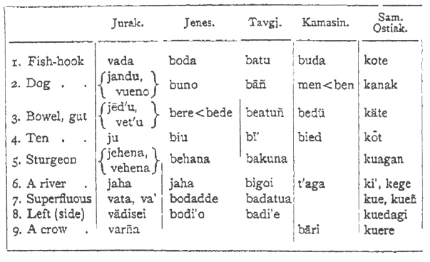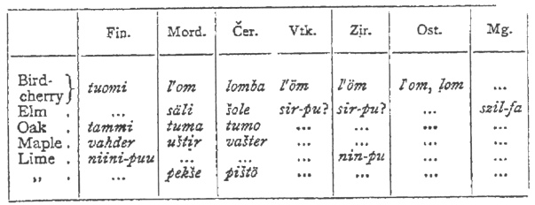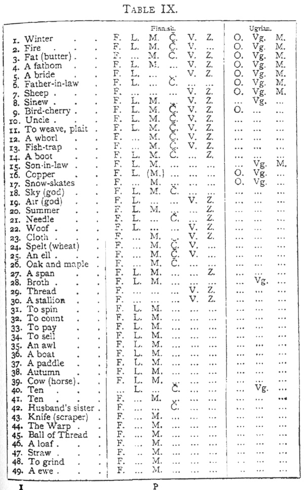 Having reviewed some of the craniological, archæological, and historical facts that bear more or less directly on the Finns, we have now to turn to comparative ethnography and philology for any help they may afford towards enabling us to form a slight picture of their prehistoric condition. Theoretically the prehistoric past may be divided into two divisions, hereafter to be mentioned as the first and second periods. To the first belong words that are common to the Ugrian and the various Finnish groups; these originated in Asia, when Finns and Ugrians seem to have lived in close contact, for the physical and craniological differences between the Finns and Ugrians are too great to allow us to suppose they are descended from a common stock. But they were neighbours, living under conditions of life precisely similar. Though we have to believe that once the remotest ancestors of the Finnish peoples lived in Asia, it is, I think, impossible to trace them there; the inference is made purely on linguistic grounds. In the craniological chapter we have found that the crania at Volósovo, and at the Ladogan station seem to have analogies with existing Eastern Finnish skulls. So there is ground for assuming that the earliest neolithic inhabitants of Central Russia were