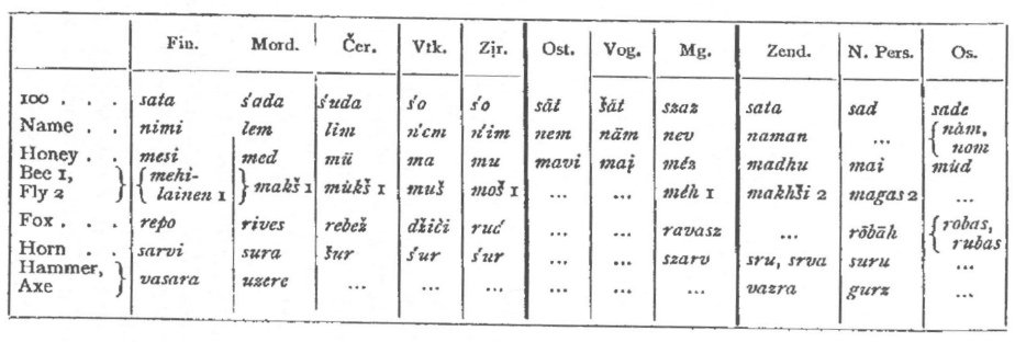 These words, it would seem, were not all adopted exactly at the same time. Some are older loans than others, and if taken from an Iranian people, the language was at an earlier stage than any existing record of it. For instance, judging from the first vowel in the West Finnish and Mordvin words for 'honey,' these are supposed to go back to an Indo-Eur. médhu, while the other East Finnish forms might come from a Zend or Bactrian form, and therefore be of later date. So, too, the front vowels in all the words for 'name' correspond best with the O. Sl. [n]imen, though the wide diffusion of the word makes it probable that the loan is earlier than any distinctly Slav word, besides the fact that it is unknown to the Letto-Lithuanian branch of the Slavs. It may strike one at first as singular that an Iranian word for 'fly' should be uniformly accepted as an appropriate