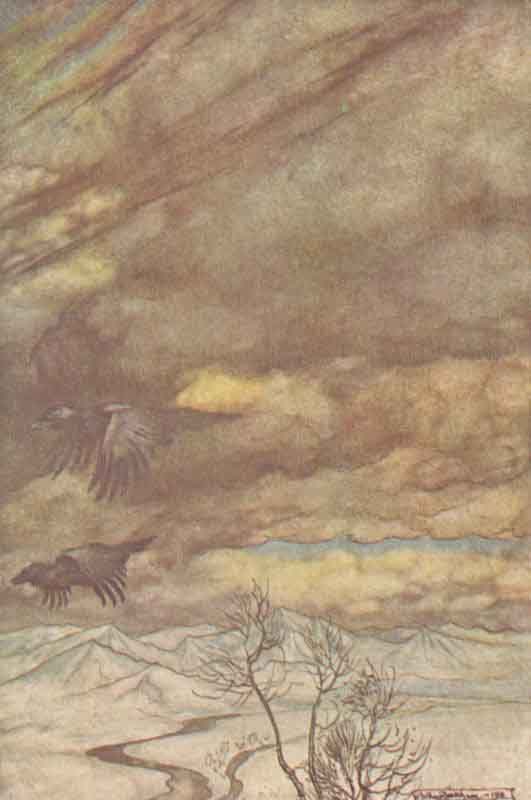 [As Gunther turns impetuously towards the hall with Brünnhilde they are met by the bridal procession coming out. Boys and girls, waving flower-wreathed staves, leap merrily in front. The vassals are carrying Siegfried on a shield and Gutrune on a seat. On the rising ground at the back men-servants and maids are taking implements and beasts for sacrifice, by the various mountain-paths, to the altars, which they deck with flowers. Siegfried and the vassals blow wedding-calls on their horns. The women invite Brünnhilde to accompany them to Gutrune's side. Brünnhilde stares blankly at Gutrune, who beckons her with a friendly smile. Is Brünnhilde is about to step back angrily Hagen comes quickly between them and presses her to wards Gunther, who takes her hand again, whereupon he allows himself to be raised on a shield by the men. Is the procession, scarcely interrupted, moves on quickly again towards the height, the curtain falls.]