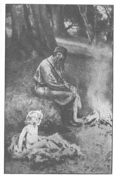 Smiling a cunning smile, the peasant then stripped off the child's blouse and cast it into the stream, so as to mislead those who would come to search for the body. Then he took Little Mikhail in his arms and hastened towards a deep and unfrequented part of the wood. There he undressed the child, and wrapping him in his own warm sheepskin coat, gathered a few handfuls of twigs and lit a fire, so as to dry the wet clothing.