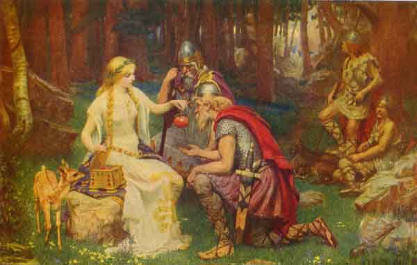 Within the court Frey and Freyja came to meet them. and they were surrounded by giant attendants. Svipdag greeted Freyja with a kiss, and she knew that she would become his bride.