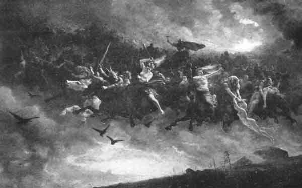 "On the plains of Vigrid is the last battle fought, A hundred miles it stretches in length, and a hundred miles in width, enclosing the wood of Vidar the Silent, where Odin is doomed to die. . . . The hosts of evil come against the hosts of Asgard. Frey leads the heroes of Valhal in the fray. He goes against black Surtur, unarmed and without fear, and by the Sword of Victory he is slain.