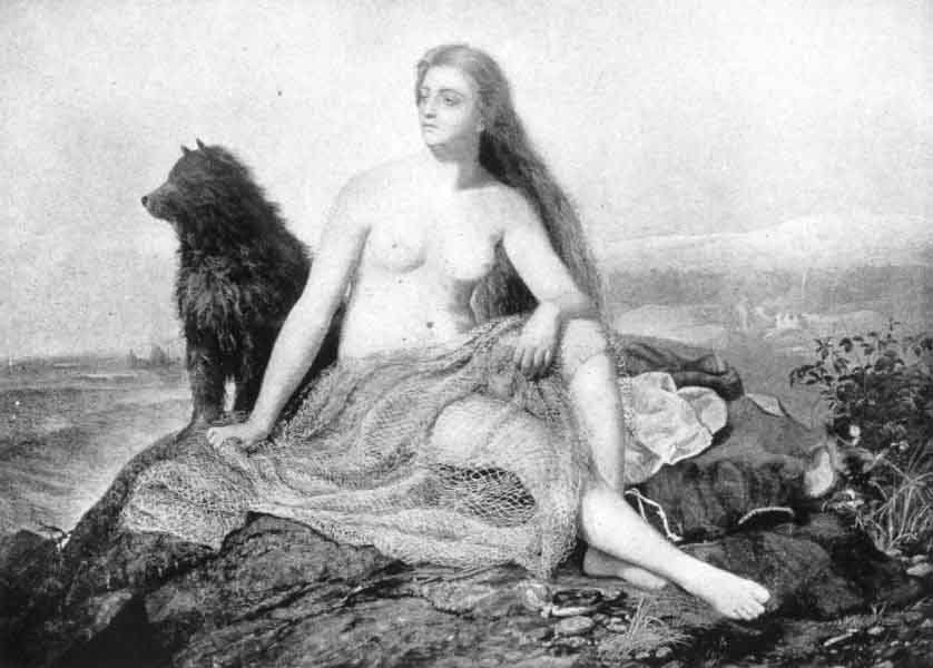 Aslog, who was named Krake in her poor dwelling, came towards the great sea king neither driving nor on foot but riding upon a goat with her feet trailing upon the ground; she came without attire, but yet not naked, because her hair was so long and bountiful that it covered her body, and she drew a net about her; she came not feasting nor yet fasting, because she held an onion to her lips and tasted of it; she was not alone, because her dog walked by her side. 1