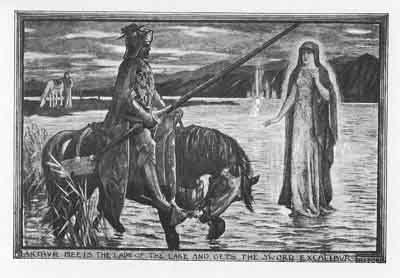 As they rode together Arthur said, 'I have no sword,' but Merlin bade him be patient and he would soon give him one. In a little while they came to a large lake, and in the midst of the lake Arthur beheld an arm rising out of the water, holding up a sword. 'Look!' said Merlin, 'that is the sword I spoke of.' And the King looked again, and a maiden stood upon the water. 'That is the Lady of the Lake,' said Merlin, 'and she is coming to you, and if you ask her courteously she will give you the sword.' So when the maiden drew near Arthur saluted her and said, 'Maiden, I pray you tell me whose sword is that which an arm is holding out of the water? I wish it were mine, for I have lost my sword.'