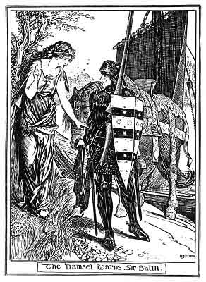 'Sir,' said a Knight to him, 'your shield does not look whole to me; I will lend you another'; so Balin listened to him and took the shield that was offered, and left his own with his own coat of arms behind him. 'He rode down to the shore, and led his horse into a boat, which took them across. When he reached the other side, a damsel came to him crying, 'O Knight Balin, why have you left your own shield behind you? Alas! you have put yourself in great danger, for by your shield you should have been known. I grieve over your doom, for there is no man living that can rival you for courage and bold deeds.'