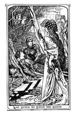 'Woe is me!' said Balin, 'all this was wrought by an unhappy Knight in the castle, who caused me to change my shield for his. If I lived, I would destroy that castle that he should not deceive other men.'