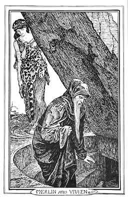 [paragraph continues] Cornwall, and one day Merlin showed Vivien a rock under which he said great marvels were hidden. Then Vivien put forth all her Powers, and told Merlin how she longed to see the wonders beneath the stone, and, in spite of all his wisdom, Merlin listened to her and crept under the rock to bring forth the strange things that lay there. And when he was under the stone she used the magic he had taught her, and the rock rolled over him, and buried him alive, as he had told King Arthur. But the damsel departed with joy, and thought no more of him: now that she knew all the magic he could teach her.