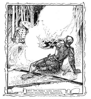 burned up both their shields, and they two fell to the earth in a great swoon; but when they awakened out of it Bors saw that his brother had no harm. With that the voice spoke to him saying, 'Bors, go hence and bear your brother fellowship no longer; but take your way to the