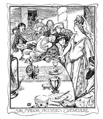 'Fair lords,' said the King at last, 'I grieve for this ill deed; but I cannot meddle therein, or do battle for my wife, for I have to judge justly. Sure I am that this deed is none of hers, therefore many a good Knight will stand her champion that she be not burned to death in a wrong quarrel. And, Sir Mador, hold not your head so high, but fix the day of battle, when you shall find a Knight to answer you, or else it were great shame to all my Court.'