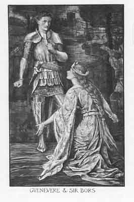 'Alas,' said the Queen, 'I throw myself on your grace,' and she went down on her knees and besought Sir Bors to have mercy on her, I else I shall have a shameful death, and one I have never deserved.' At that King Arthur came in, and found her kneeling before Sir Bors.