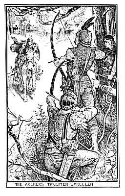 Sir Lancelot put his horse into the water at Westminster, and he swam straight over to Lambeth, and soon after he landed he found traces of the fight. He rode along the track till he came to the wood, where the archers were lying waiting for him, and when they saw him, they bade him on peril of his life to go no further along that path.