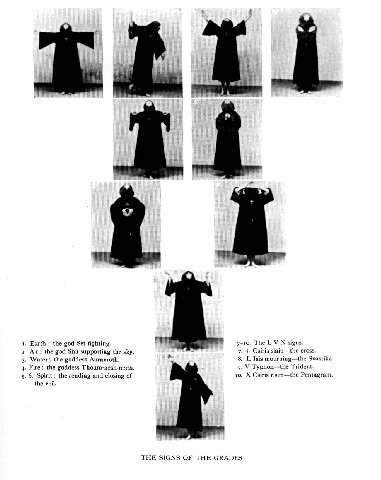 The Signs of the Portal ("see" Illustrations): Extend the hands in front of you, palms outwards, separate them as if in the act of rending asunder a veil or curtain (actives), and then bring them together as if closing it up again and let them fall to the side (passives).