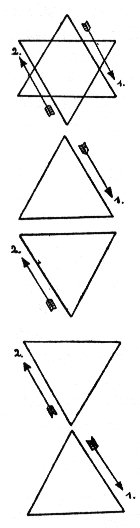 This hexagram consists of two equilateral triangles, both apices pointed upwards. Begin at the top of the upper {23} triangle and trace it in a dextro-rotary direction. The top of the lower triangle should coincide with the central point of the upper triangle.