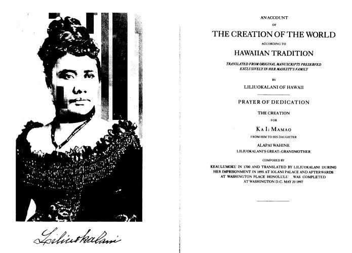 KEAULUMOKU IN 1700 AND TRANSLATED BY LILIUOKALANI DURING HER IMPRISONMENT IN 1895 AT IOLANI PALACE AND AFTERWARDS AT WASHINGTON PLACE HONOLULU WAS COMPLETED AT WASHINGTON D.C. MAY 20, 1897