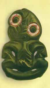 Nephrite ornament and amulet, known as Hei-tiki. It is supposed to represent a human foetus and is worn to preserve the wearer against attacks of the spirits of still-born children, who are supposed to be especially malicious because they regard themselves as cheated out of the chance of life. Maori of New Zealand. Peabody Museum, Salem, Massachusetts.