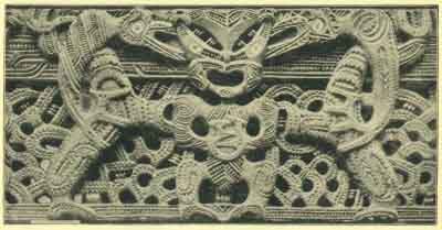 Portion of the carved front of a "pataka," or store-house, in New Zealand. The human figure represents some mythical being, attacked by monsters. After Hamilton, Maori Art, Plate XXIII.