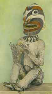 Figure made of tapa over a slender framework or wood, showing a man with typical tatuing. These images were probably used in connexion with ancestral worship. Easter Island. Peabody Museum, Cambridge, Massachusetts.
