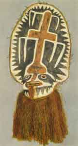 Mask worn in dances in which the participants represent ghosts and sprits. The mask is made of a light bamboo frame, covered with tapa, or beaten bark-cloth. The fringe covers the wearer down to the ankles. Elema tribe, Gulf of Papua, New Guinea. Peabody Museum, Cambridge, Massachusetts.