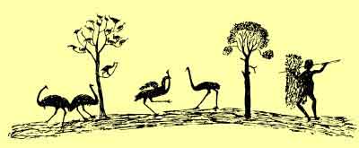 Native drawing of Wurruna, spearing the emus just before he met the seven sky-maidens. After Parker, Australian Legendary Tales, p. 24.