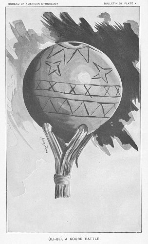 The hula úli-ulí was so called from the rattle which was its sole instrument of accompaniment. This consisted of a small gourd about, the size of a large orange, into the cavity of which were put shot-like seeds, like those of the canna; a handle was then attached (pl. xi).