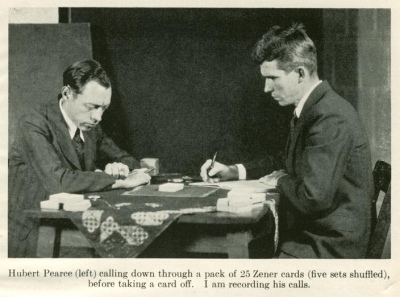 Hubert Pearce (left) calling down through a pack of 25 Zener cards (five sets shuffled), before taking a card off. I am recording his calls.