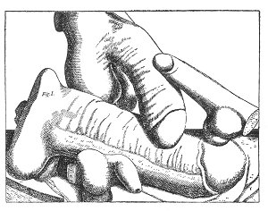 arch look and gesture, stretches out its right hand in the form above mentioned 1; and which probably was an emblem of consummation: and as a further proof of it, the Amulet which occurs most frequently amongst those of the Ancients (next to that which represents the simple Priapus), is such a hand united with the Phallus; of which you may see several specimens in my collection in the British Museum. One in particular, I recollect, has also the half-moon joined to the hand and Phallus; which half-moon is supposed to have an allusion to the female menses. The shell, or concha veneris, is evidently an emblem of the female part of generation. It is very natural then to suppose, that the Amulets representing the Phallus alone, so visibly indecent, may have been long out of use in this civilized capital; but I have been assured, that it is but very lately that the Priests have put an end to the wearing of such Amulets in Calabria, and other distant Provinces of this Kingdom.