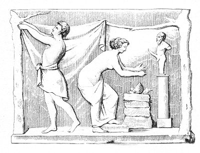 EVERYTHING in this bas-relief indicates an interior scene, an act of candour and piety, and not a disgusting orgy. The a married pair, clad as decently as the nature of the sacrifice to which they are about to proceed will allow, seem to be asking the god who presides over generation to put an end to a grievous sterility; the expressive gestures of the woman, especially, bear out this explanation. The husband is occupied in stretching out a curtain which is to veil from profane eyes the mysteries of the sacrifice.