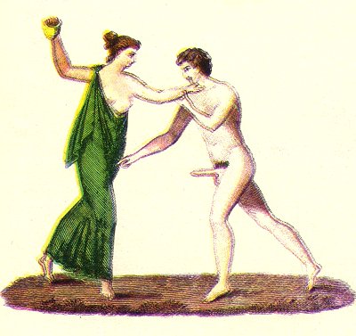 THIS fresco was discovered in 1826, at Pompeii. It is supposed that the house where it was found was one of those places of debauchery called lupanaria. In one of the principal rooms of the house may be seen a painting representing some youths and courtezans abandoning to the pleasures of the table and to play: one of the young men, the hero of the fresco we are describing, heated, doubtless, by the fumes of wine, is pursuing a woman. His gestures leave no doubt as to the nature of his intentions; but his fair companion, alarmed at the sight of the prodigious instrument with which he menaces her, seizes her lover by the throat, and endeavours to push him back: she even seems on the point of hurling at his head a vase which she holds in her right hand.